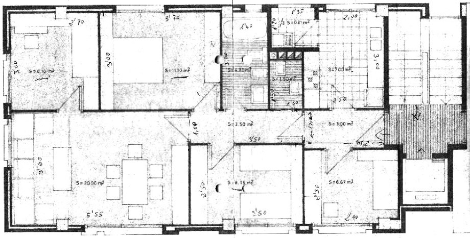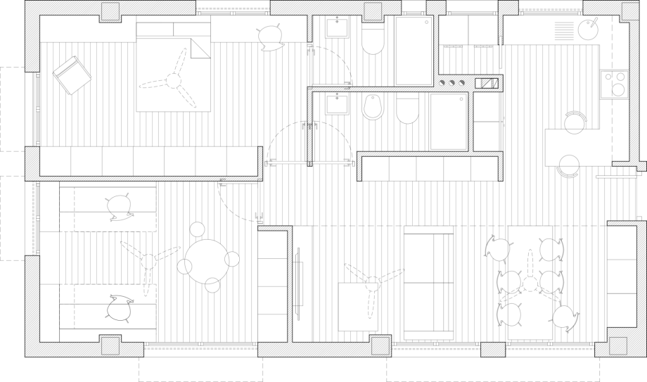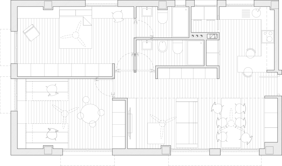 La vivienda había sido propiedad de los padres de uno de los nuevos ocupantes. Su antigua distribución entorno a un largo pasillo y con el salón al fondo pedía a gritos un gran cambio. Las tres fachadas [sur / oeste / norte] daban grandes posibilidades de soleamiento y ventilación.